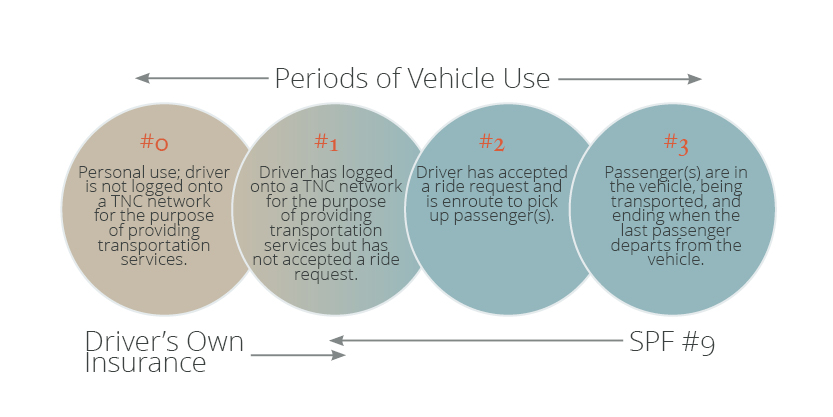 Auto insurance coverage for TNC drivers is based on four periods of vehicle use: